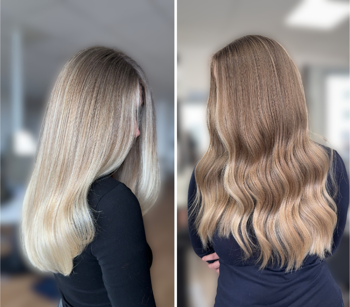 Cette approche permet de créer un balayage au rendu très naturel, sans dénaturer la base. Des placements stratégiques peu nombreux (18 papiers) pour une construction d'ombres et de lumières. Pour nos clientes qui ne veulent pas être "toute blonde".