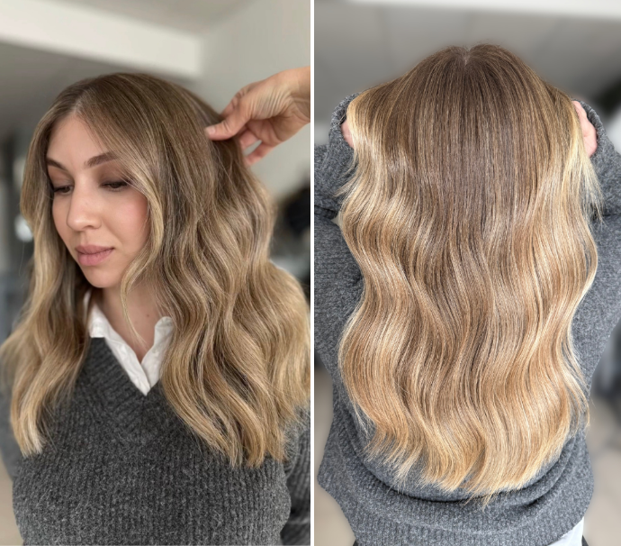 Cette approche permet de créer un balayage au rendu très naturel, sans dénaturer la base. Des placements stratégiques peu nombreux (18 papiers) pour une construction d'ombres et de lumières. Pour nos clientes qui ne veulent pas être "toute blonde".